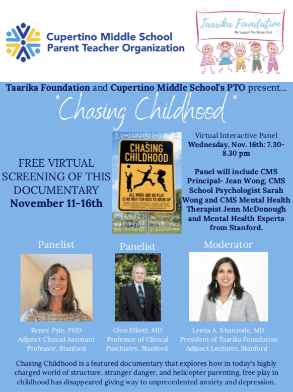 Taarika in partnership with CMS PTO offered a free virtual screening for the documentary – Chasing Childhood – to 100 parents in the community followed by a well-attended panel with mental health experts on November 16th.