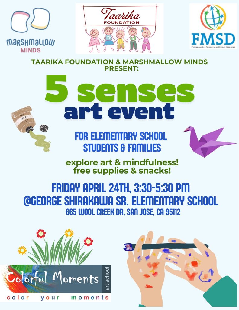 Get ready for a fun-filled, hands-on experience at the 5 Senses Art Event, presented by Taarika Foundation and Marshmallow Minds! Designed for elementary school students and their families, this interactive event invites children to explore creativity through all five senses while building mindfulness and self-expression. From colorful art activities to engaging sensory experiences, there’s something for everyone to enjoy—plus free supplies and snacks! Join us for an afternoon of creativity, connection, and colorful moments you won’t want to miss.